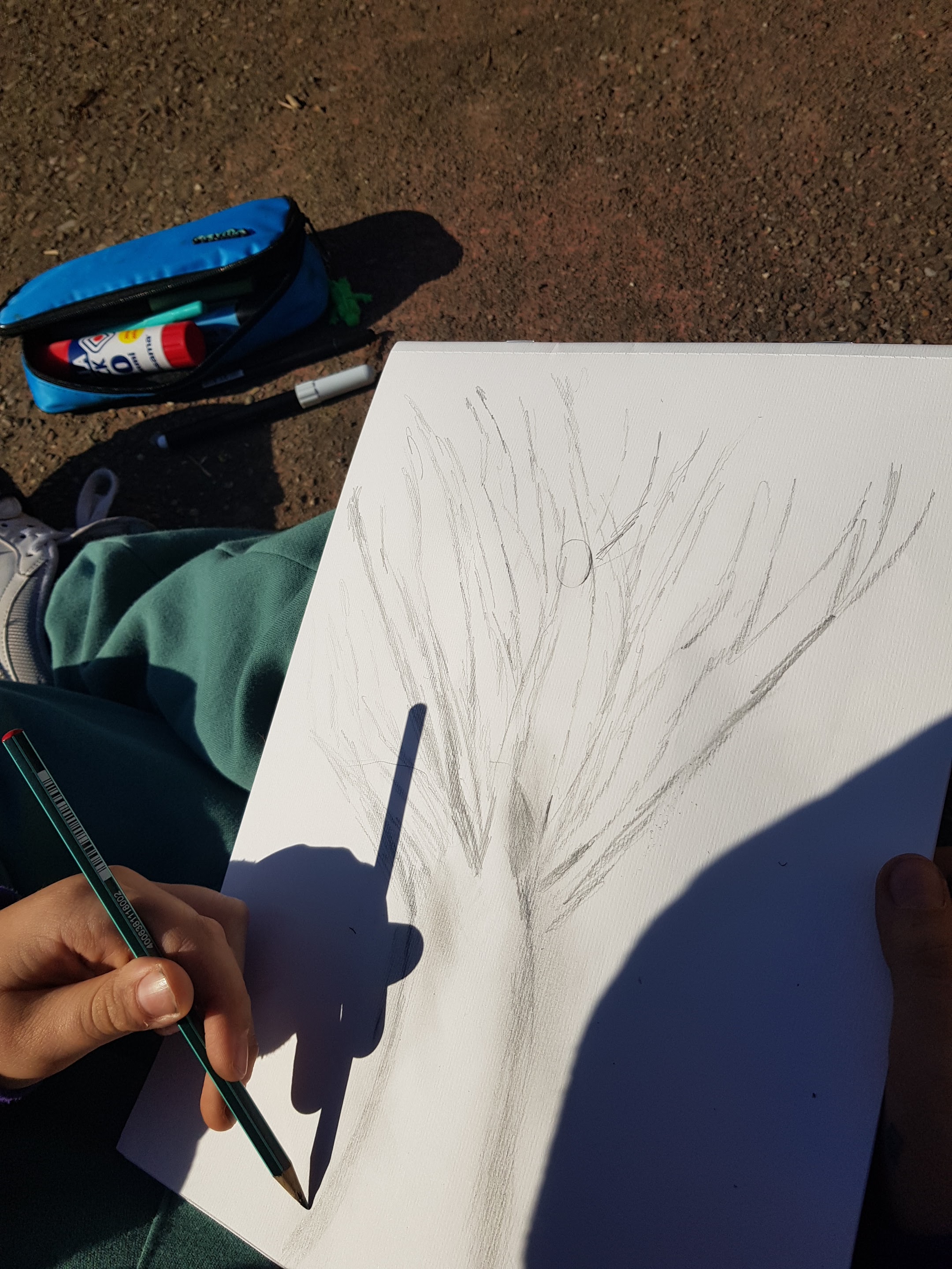 E allora, si esce! Non importa se fa ancora freddo, se il sole rimane nascosto nel cielo ovattato: con giacca, foglio, album e matite da disegno, le due classi prime hanno realizzato delle copie dal vero di alberi. Ognuno ha scelto un albero, un punto di vista, si è accomodato ed ha iniziato ad osservarne la struttura, le diramazioni, la texture del tronco per poi disegnare in modo verosimile il proprio albero sul foglio. Il disegno è stato terminato con il chiaroscuro a graffite e l'ombra portata.